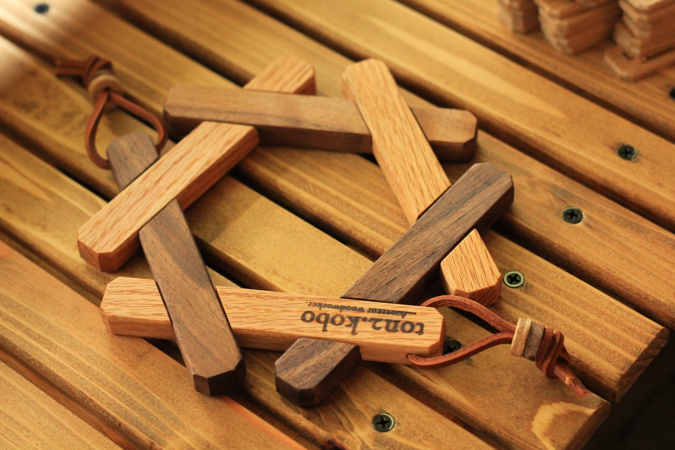 アクセントにレザーコード、ハンドメイドウッドビーズを付けています。